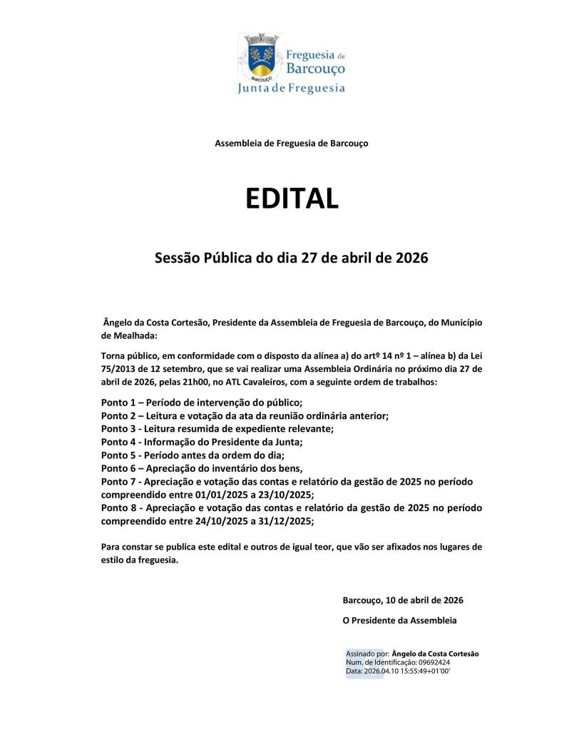 Torna público, em conformidade com o disposto da alínea a) do artº 14 nº 1 – alínea b) da Lei 75/2013 de 12 setembro, que se vai realizar uma Assembleia Ordinária no próximo dia 27 de abril de 2026, pelas 21h00, no ATL Cavalheiros, com a seguinte ordem de trabalhos: